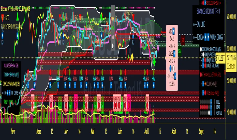 SUPERTREND ICHIMOHU + DMI : les 2 Super trends sont ensemble soit bullish soit Bearish. Sinon le signal est neutre.