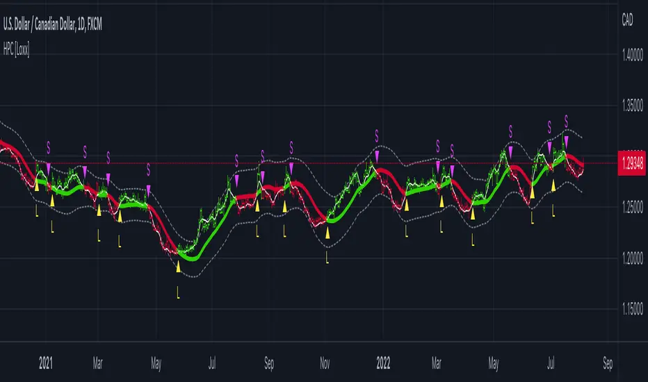 Hodrick-Prescott Channel [Loxx] is a fast and slow moving average that moves inside a channel. Breakouts are when the fast ma crosses up over the slow ma and breakdowns are the opposite. The white moving average is the fast ma, the slow moving average is the red/green ma.