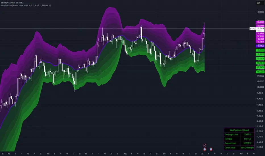 The Value Spectrum is an indicator designed to provide traders with a visual and quantitative assessment of price positioning relative to a dynamic baseline, helping to identify potential value zones, overextensions, and fair value conditions in various market environments. It builds on traditional volatility envelope concepts but introduces multi-tiered bands with customizable smoothing and a spectrum-based classification system to offer a more nuanced view of market conditions. This allows traders to quickly gauge where price stands in its "value spectrum" without relying solely on binary overbought/oversold signals.