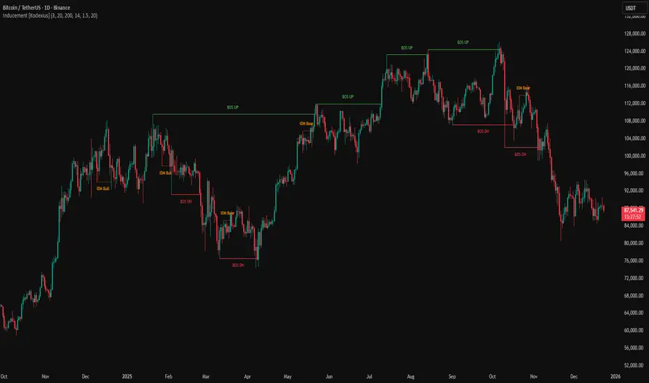 The overlay is designed to be readable and practical: BOS levels are presented clearly, and inducements are marked with distinct level styling and labeling (bullish vs bearish). The visual output aims to support fast decision making without overwhelming the chart.