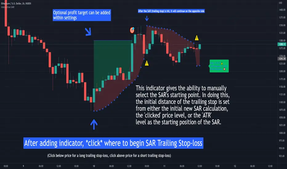 Unlike the normal Parabolic SAR, this indicator allows for the modification of the start point of the Parabolic SAR’s first bar calculation. Normally, the Parabolic SAR automatically has a start point after the first bar of an asset’s historical price that will then switch between trailing above and below price respectively. It must be noted that due to how the first position of the Parabolic SAR is calculated, on occasion the Parabolic SAR will immediately flip on the next bar to the opposite side relative to price that it was just located. Modifying the setting “⭐Initial Interactive SAR Position Source”, then selecting either 'Clicked' or 'ATR' level as the vertical start position will prevent this. See images below for more explanation.