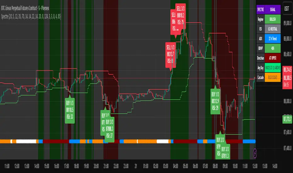 This indicator replaces the Regime Engine, which will continue to evolve independently as an experimental platform for testing new strategies and enhancements. Spectre was selected as the production replacement based on extensive backtesting across multiple assets and timeframes, which demonstrated superior win rates compared to alternative sell logic approaches (RSI-based exits outperformed CMO-based exits in 13 of 18 test configurations).
