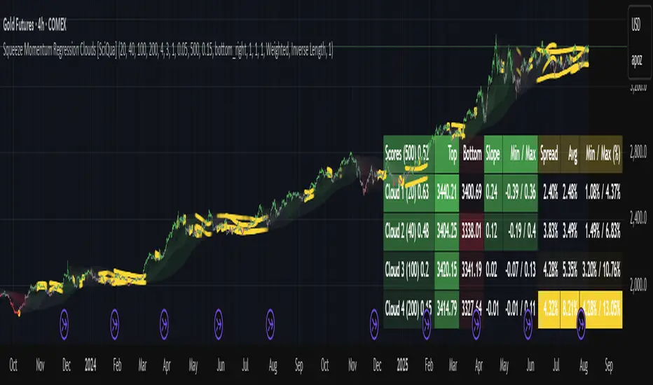 The Squeeze Momentum Regression Clouds (SMRC) indicator is a powerful visual tool for identifying price compression, trend strength, and slope momentum using multiple layers of linear regression Clouds. Designed to extend the classic squeeze framework, this indicator captures the behavior of price through dynamic slope detection, percentile-based spread analytics, and an optional UI for trend inspection — across up to four customizable regression Clouds.