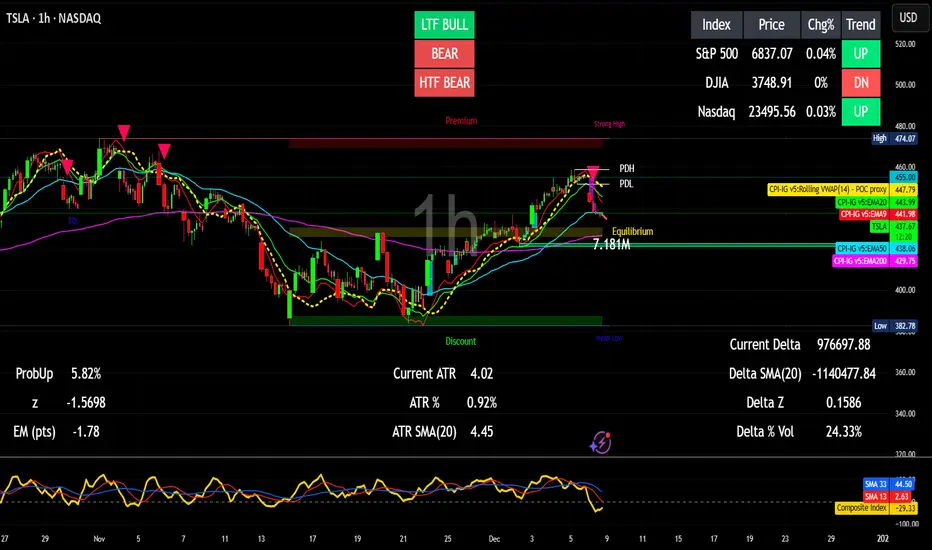 The Composite Predictive Index (CPI-IG v5) is the creation of Alcides Davila (Alcides0265), Daily Trader. This indicator, which I call "The Predictor Index" and is also known as "The Composite Predictive Index (CPI-IG v5)", is an overlay indicator designed for institutional-grade market analysis and trading signals. Daily traders could also take advantage of this indicator by making the necessary adjustments for each trading session, whether for short-term (scalping), medium-term, or long-term investments. It synthesizes multiple technical factors (e.g., RSI, MACD, Bollinger Bands, VWAP, EMAs/SMAs, volume pressure, delta volume, manual sentiment/news inputs) into a weighted Z-score-based probability model (probUp) for forecasting price direction—generating buy/sell gates, strong/ultra signals, and short-term projections. It supports multi-timeframe alignment (HTF/LTF), breakout/breakdown detection with retests, internal backtesting, and alerts, while displaying dashboards for probabilities, stats, oscillators (bull/bear/neutral), major indexes (S&P, DJIA, Nasdaq), and ETFs (SPY, QQQ, etc.).