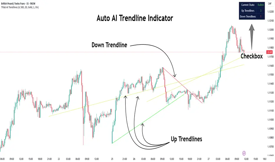 Customizable settings, like trendline count and pivot range, adapt to diverse trading styles. The real-time table simplifies trend monitoring, enhancing efficiency. It suits forex, stocks, and crypto markets.