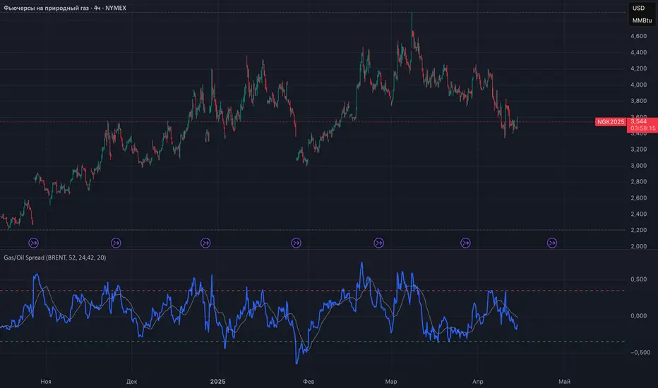 This indicator measures the spread between the actual price of natural gas and its oil-based equivalent, derived from a defined oil/gas ratio. It helps traders identify potential mispricings and mean-reversion opportunities between the two energy commodities.