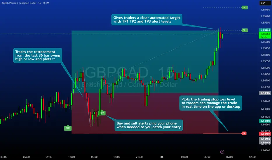 This tool is designed for traders who want to systematically identify counter-trend entries within established trends. Rather than manually drawing retracement levels, the indicator automates the process and provides immediate visual feedback on potential entry zones with pre-calculated risk and reward parameters.