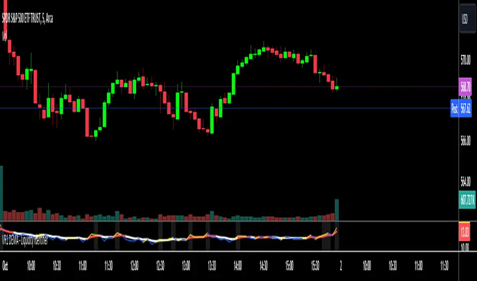 VR1 DEMA - Liquidity IdentifierThe VR1 DEMA - Liquidity Identifier is a powerful TradingView indicator designed to help traders visualize and identify areas of high liquidity in the market. The core concept is based on the premise that periods of heavy volume with minimal price movement signify zones of increased liquidity. Recognizing these zones can be crucial for traders aiming to anticipate significant market moves or validate support and resistance levels.