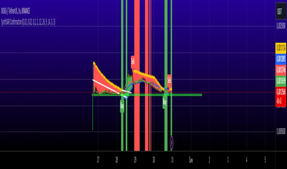 SynthSAR Confirmation IndicatorThe SynthSAR Confirmation Indicator combines multiple technical analysis tools into a comprehensive trading system. It includes three Exponential Moving Averages (EMA), the Parabolic SAR (PSAR), the MACD, Stochastic Oscillator, and the Awesome Oscillator to provide reliable entry and exit signals.Key Features:EMA Crossovers: The indicator plots three EMAs (9, 14, and 21 periods) to help identify trend direction.Parabolic SAR: It highlights the trend direction and signals potential reversal points. Buy and sell signals are generated when the PSAR flips its position relative to the price.MACD and Stochastic Oscillator: These oscillators are used to confirm the strength of a trend or signal, with the MACD providing momentum analysis and the Stochastic Oscillator showing overbought or oversold conditions.Awesome Oscillator: This helps in identifying the market momentum and confirming the strength of buy or sell signals.Combined Signal Confirmation: The indicator integrates signals from the MACD, Stochastic, and Awesome Oscillator to provide a unified signal for market direction.Visual Aids: The indicator provides clear visual signals on the chart, including highlighted start points for long and short trades, and labels for buy/sell actions.Usage:The indicator is best used in trending markets, where it helps in identifying entry and exit points based on the combined analysis of several indicators.Ideal for traders looking for a systematic approach to trading with confirmations from multiple technical indicators.