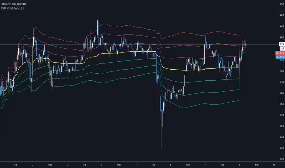 Uses volume weighted EMA for the interval as the basis/vwap & exponential deviations calculated using the exponential vwap as the mean.