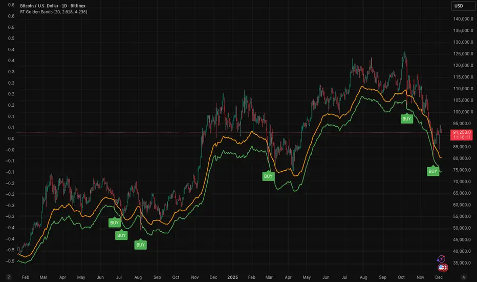 RoseTree Golden Bands is a volatility-based support indicator that uses Fibonacci ratios combined with Average True Range (ATR) to identify potential buy zones below price action.