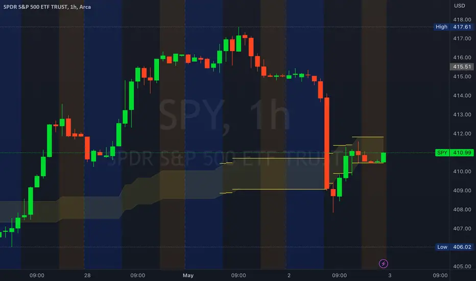 The script plots the Fibonacci levels in the background, enabling traders to identify potential support and resistance levels quickly. The Golden Zone is highlighted with a yellow filled area, making it easy to spot on the chart. Traders use this zone to identify areas where the stock price may react, either bouncing off the support level or encountering resistance at the resistance level.
