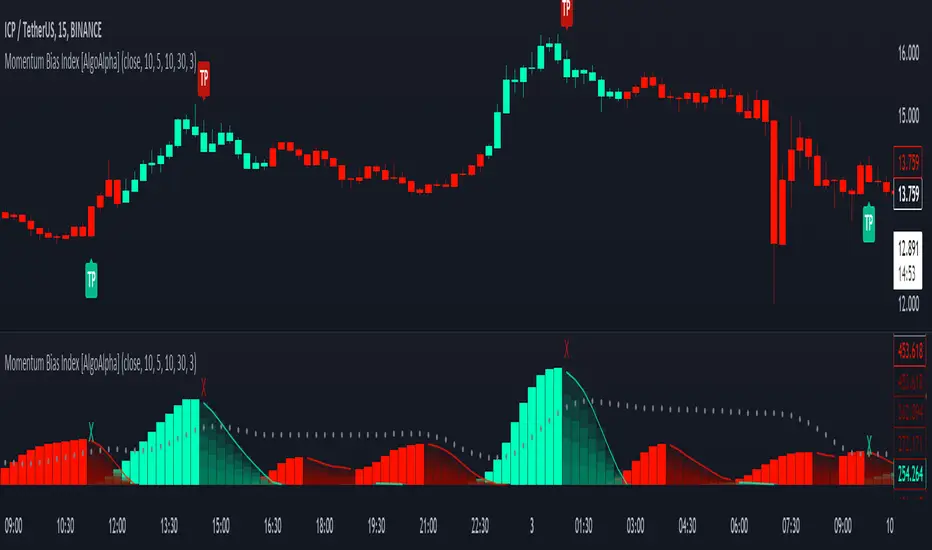 The Momentum Bias Index by AlgoAlpha is designed to provide traders with a powerful tool for assessing market momentum bias. The indicator calculates the positive and negative bias of momentum to gauge which one is greater to determine the trend.