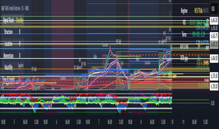 A one‑look market regime dashboard for ES, NQ, YM, RTY, and SPY that tells you when to play defense, when you might have an offense cue, and when to chill. It blends VIX, VIX term structure, ATR 5 over 60, and session gap signals with clean alerts and a compact table you can park anywhere.