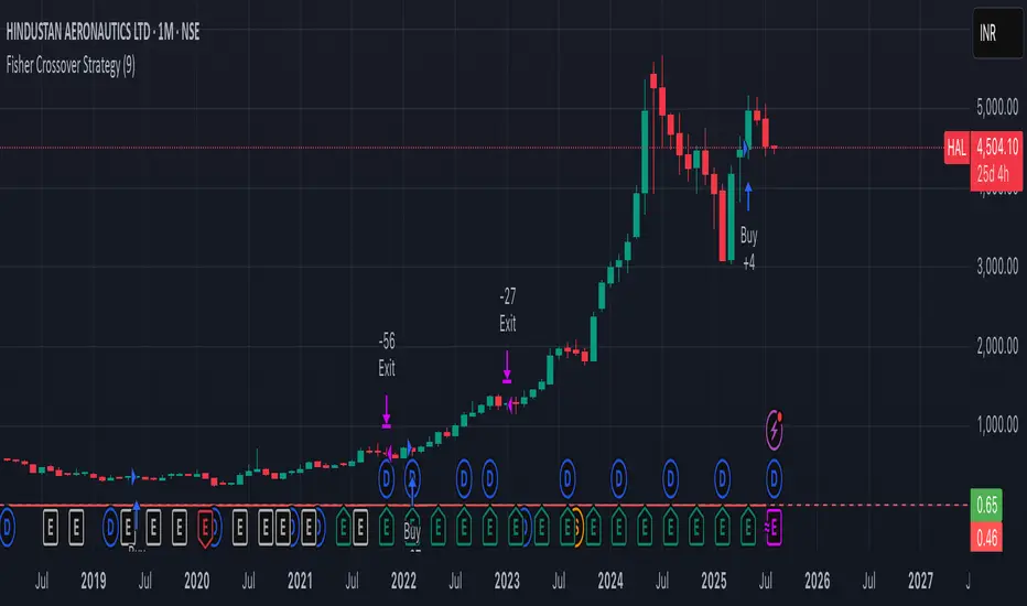The **Fisher Crossover Strategy** is a momentum-based trading strategy that uses the Fisher Transform indicator to identify potential bullish reversals. The Fisher Transform mathematically converts market prices into a Gaussian normal distribution, making turning points sharper and more visible. In this strategy, a **Fisher line** and a **Trigger line** (the previous bar’s Fisher value) are plotted. A long entry is generated when the Fisher line crosses above the Trigger line and is below the level of 1, signaling a potential shift from bearish to bullish momentum. The trade is exited when the Fisher line crosses back below the Trigger line and is above the level of 1, indicating a loss of momentum.The strategy is designed to take **only one trade at a time** and confirms entries and exits only at candle close to reduce false signals. It uses a fixed cash amount of ₹20,000 per trade and is applied directly on the price chart. The Fisher line is plotted in green, the Trigger line in red, and a horizontal reference line at level 1 helps visually identify overbought or strong momentum conditions. Overall, this strategy works best in trending or volatile markets and may produce false signals during sideways movements.