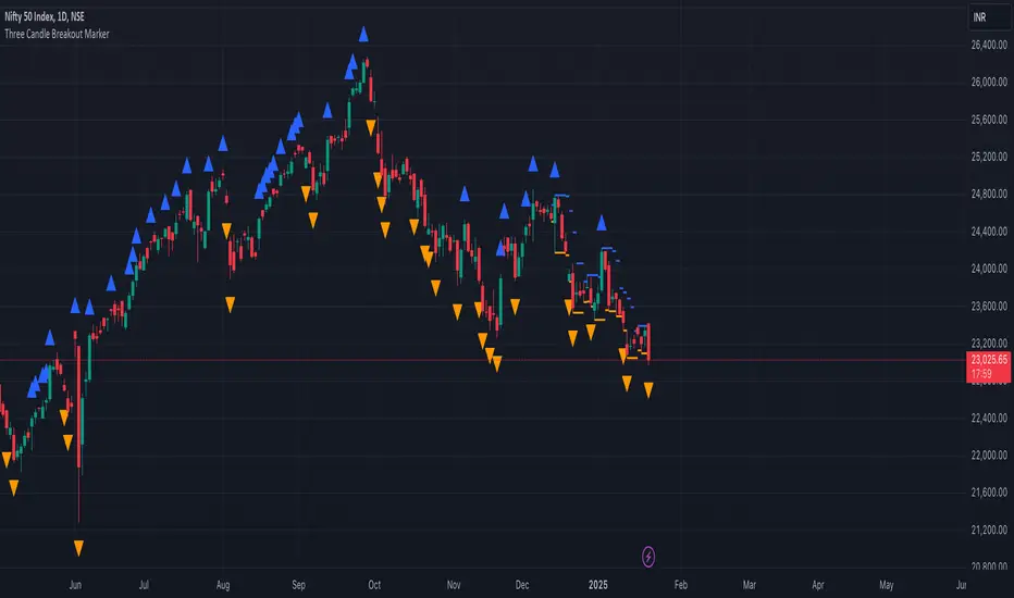 The **Three Candle Breakout Marker** is a powerful trading indicator designed for traders who want to identify significant price movements based on recent price action. This script marks candles that break above the highest high or below the lowest low of the previous three candles, providing clear visual signals for potential trading opportunities.