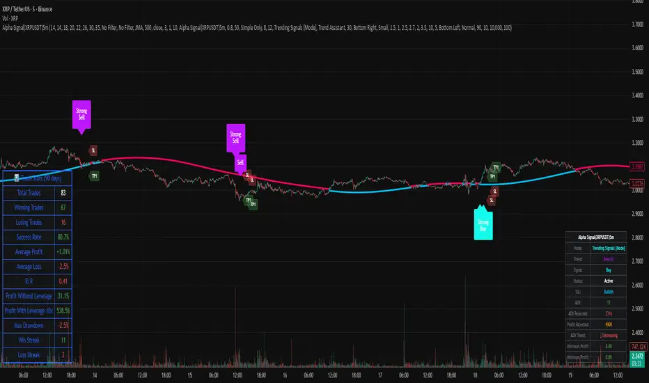 Alpha Signal (XRPUSDT).5m is an advanced short‑term technical indicator designed for five‑minute market intervals. It integrates layered filtering, behavioral sequencing, and adaptive risk handling to deliver clean, non‑repainting trading signals under real volatility conditions.