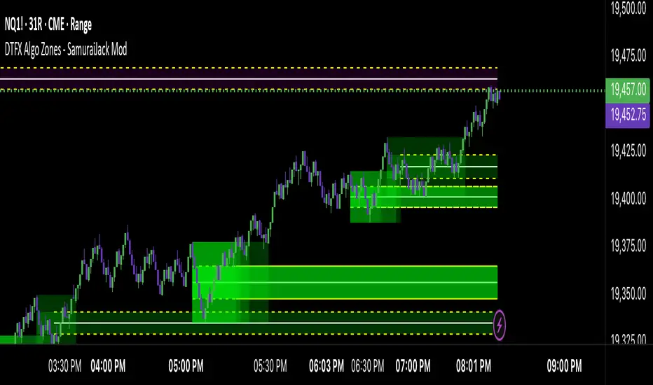 This indicator is a modified version of an open-source tool originally developed by Lux Algo. I literally modded their indicator to create the DTFX Algo Zones [SamuraiJack] version, incorporating additional features and refinements. Special thanks to Lux Algo for their original work and for providing the open-source code that made this development possible.