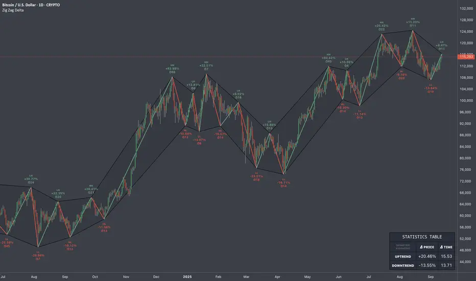 “Zig Zag Trend Metrics” is a highly versatile indicator, built on the classic Zig Zag concept and thoughtfully designed for technical traders seeking a deeper, more structured view of market dynamics. This tool identifies significant swing highs and lows, classifies them, and annotates each with key metrics, offering a precise snapshot of each movement. It enhances visual analysis by drawing connecting lines that outline the flow of market structure, making trend progression and reversals instantly recognizable. Beyond visual mapping, it features a compact, real-time statistics table that calculates the average price and time deltas for both bullish and bearish swings, giving traders deep insights into trend momentum and rhythm. With extensive customization options, this indicator adapts seamlessly to vast trading styles or chart setups, empowering traders to spot patterns, evaluate trend strength, and make more confident, data-backed decisions.