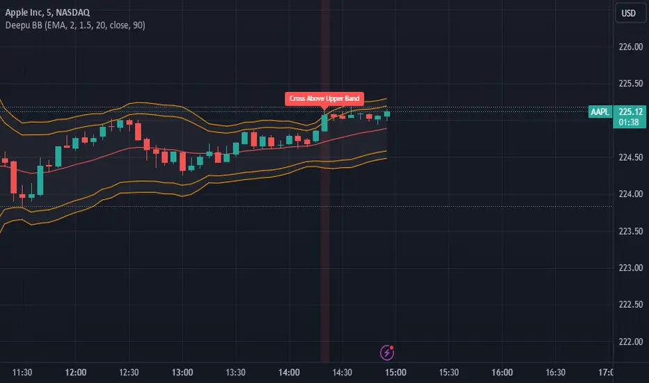 Alerts for Crossovers: Alerts are triggered whenever the price crosses above the upper band or below the lower band, giving you timely notifications of potential breakout or breakdown scenarios.