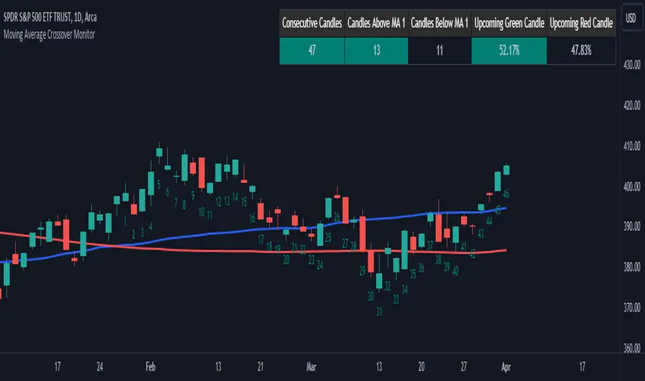 The Moving Average Crossover Monitor is a specialized tool crafted for traders seeking to understand and predict market trends more effectively. This indicator's primary focus lies in analyzing consecutive candle movements above or below specified moving averages and providing predictive estimates based on historical data.