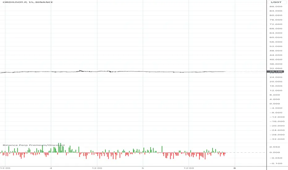 This TradingView Pine Script indicator calculates and displays the premium or discount percentage between a cryptocurrency's spot price and its corresponding perpetual futures (perp) price on Binance. It automatically detects whether the current chart symbol represents a spot or perp market by checking for the ".P" suffix. The script then retrieves the closing prices for both the spot and perp symbols using the request.security function. If valid data is available for both markets, it computes the premium or discount as a percentage and visualizes this difference as a histogram below the main chart. Green bars indicate a premium (perp price above spot), while red bars signify a discount (perp price below spot). The indicator includes error handling to display 'n/a' when data for the required symbols is unavailable, ensuring robustness across various chart applications.