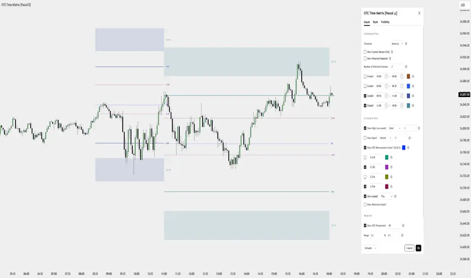 “OTE Time Matrix [Pascal ⧋]” anchors each session’s range to the current session open, then projects OTE retracements and expansion zones. It’s session-aware, timezone-aware, and market-aware (stocks, futures, forex, crypto) with safeguards for RTH and futures quirks.
