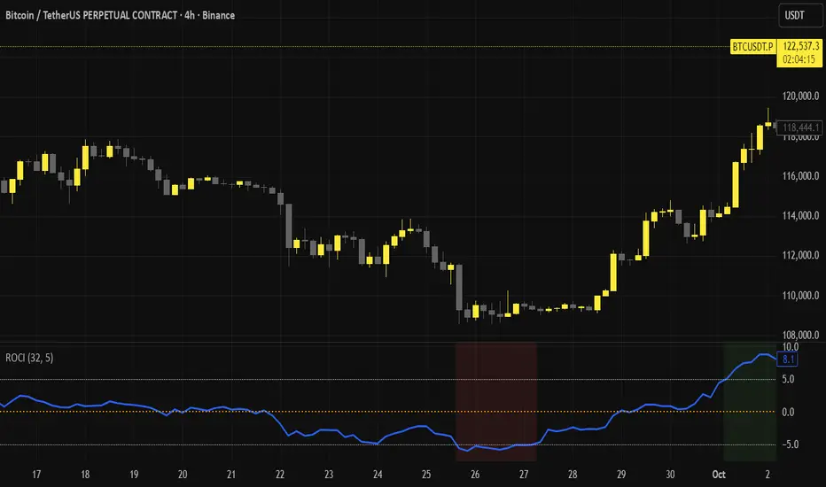 ROCI tells you how fast price changed vs N bars ago, in percent. It’s a clean momentum gauge: