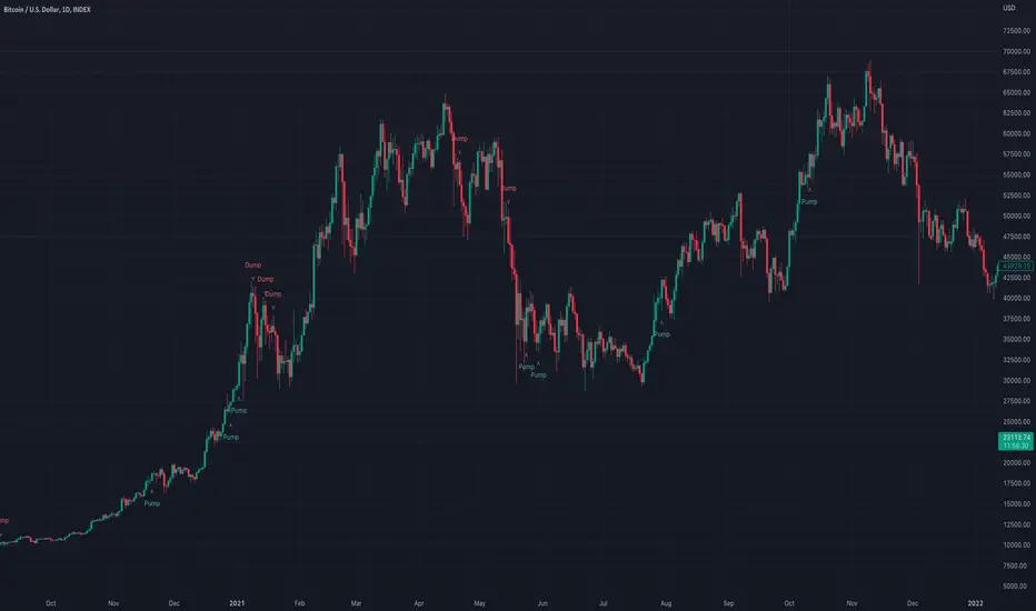 This indicator picks ups a particular breed of pump and dump. It requires a lot of setup for a chart to pump or dump and it typically involves breaking the parallel channel of current price action. In this case the script is looking for rare moments support and resistance is pushed to its extreme allowing price action to easily setup this move as it ducks through a very strong dynamic support and resistance band. Sensitivity can be adjusted in the settings. For slower charts like weekly or monthly you can push it all the way to extreme. For faster charts like 4hr and hourly slow it down. It's a good idea to tune it to whatever chart and timeframe you are looking at.