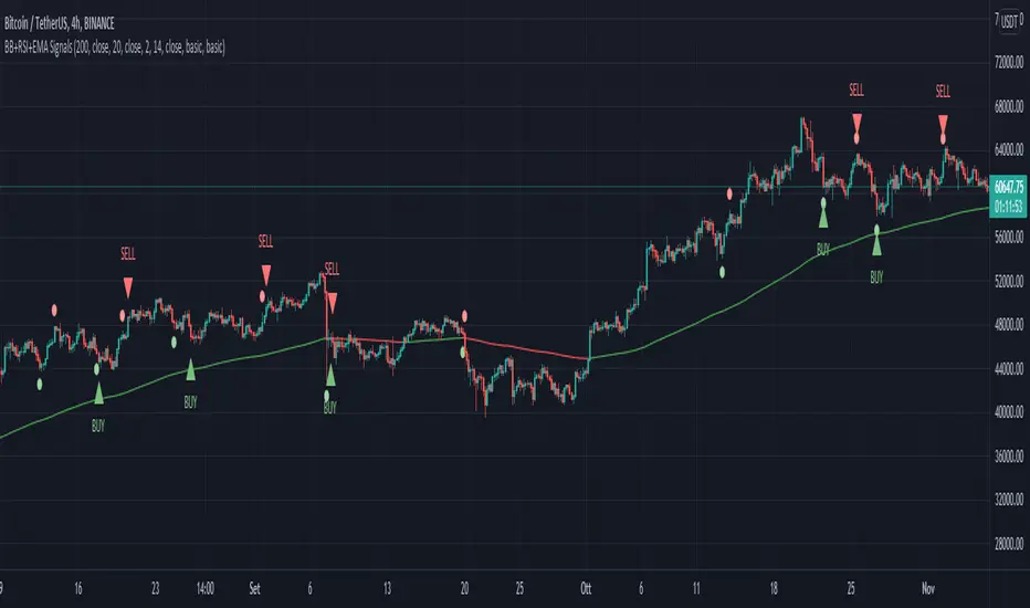 The indicator gives signals based on candles touching BB lines and RSI oversold/overbought conditions, also a 200 EMA filter is used to trade following the major trend.