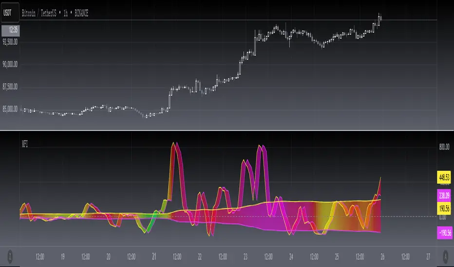 Observe the plotted MFI line and its gradient colors to assess market conditions.