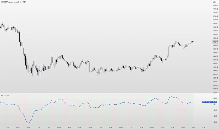 This indicator does not perform actual Hilbert-Huang Transform calculations. True HHT involves complex mathematical processes including Empirical Mode Decomposition (EMD) that cannot be accurately replicated with simple moving averages. This indicator provides a simplified oscillating signal based on double EMA smoothing.