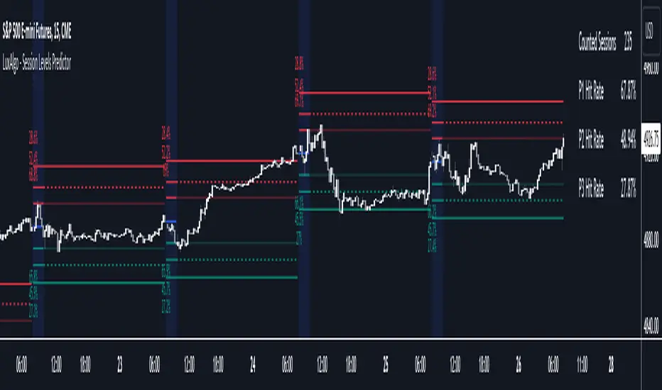 The "Session Levels Predictor" indicator predicts the maximum/minimum levels that will be made within a user-specified session. Hit rate percentages are displayed to measure how often a specific level has been hit.