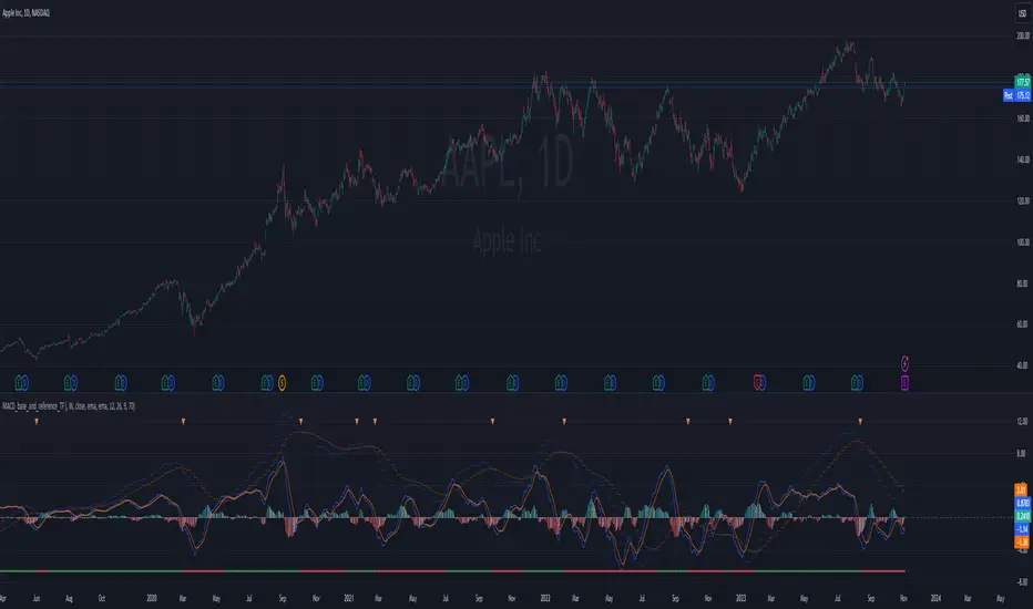 The "MACD_with_reference" indicator aims to illustrate the MACD (Moving Average Convergence Divergence) on two distinct timeframes: the base timeframe (typically the chart's timeframe, e.g., 1D) and the reference timeframe (defaulted to 1W). This tool provides a means to determine momentum shifts within the stock, potentially guiding traders in adjusting or trimming positions.