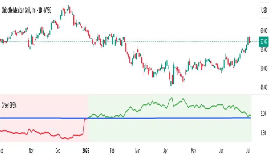 Greer EPS Yield is a valuation-focused indicator from the Greer Financial Toolkit, designed to evaluate how efficiently a company generates earnings relative to its current stock price. This script calculates the Earnings Per Share Yield (EPS%), using the formula: