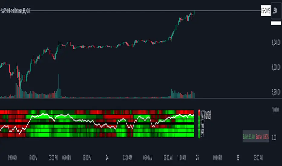 The Index Trend Map is a versatile and powerful tool designed to provide a sentiment heatmap for major market indices. This indicator tracks the average trend direction across multiple indices data points, including a default setting for S&P 500 Futures (