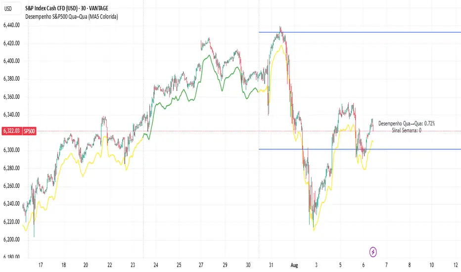 This Pine Script v5 indicator calculates the performance from Wednesday to Wednesday at 10:30 AM for the charted instrument. Every Wednesday at that time, it records the closing price and computes the percentage change, assigning a signal: +1 for increases above 1 %, -1 for declines below -1 %, and 0 for intermediate movements. It plots a five-period simple moving average on the main chart, color-coded green, red, or gray based on the weekly signal. Vertical dotted lines mark each weekly separation, and two blue horizontal lines denote the ±1 % thresholds for the current week. A label displays the performance percentage and signal.