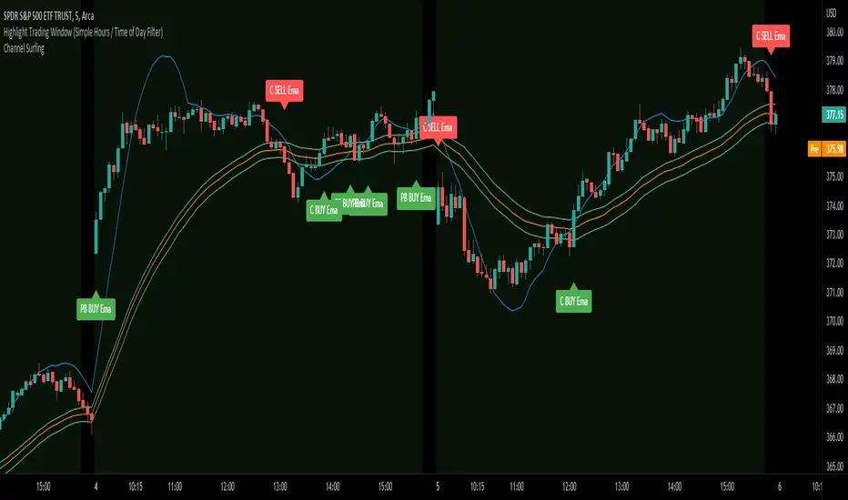 This is my Channel Surfing indicator. It fires Buy and Sell signals based on multiple conditions. You can use EMAs or LSMAs. You will have to check the box of which moving averages to use once you add it to the chart. It plots EMAs or LSMAs using the different sources Close, Low, and High as the channel to surf. It fires a Buy signal if price crosses the channel up and if there is a pullback into the channel followed by a breakout to the upside. It fires a Sell signal if price crosses the channel down and if there is a pullback into the channel followed buy a breakdown to the down side. I find it works great on the 5 minute SPY chart and the 1 minute chart of ES with the default settings when scalping. You are able to switch between 2 different channels using LSMAs or EMAs. The EMAs has an optional LSMA slope filter for getting rid of some false signals. Let me know if you guys find any other settings or ways to use this and as always I hope it helps.