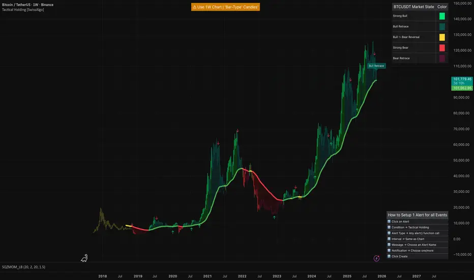 This indicator is designed for higher timeframe analysis. While it can be applied to other timeframes, the logic and signal generation are optimized for weekly charts to filter out short-term noise and focus on major market cycles.