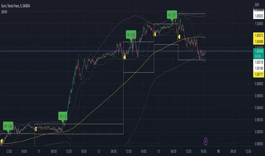 If price now closes above the lower (fast) bb, the indicator draws a label at the open of the next candle (which would be a potential entry point). Take profit becomes the upper bollinger band, stop loss the same distance below the open of the candle.