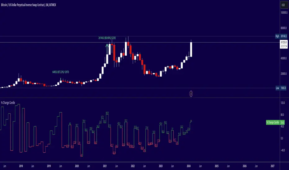 The indicator calculates the percentage difference between the highest and lowest prices for each candle. If the closing price of the candle is higher than the opening price, suggesting that the price has gone up during that period, the indicator will display this percentage increase as a green line. Conversely, if the closing price is lower than the opening price, indicating a price decrease, it will display the percentage decrease as a red line.