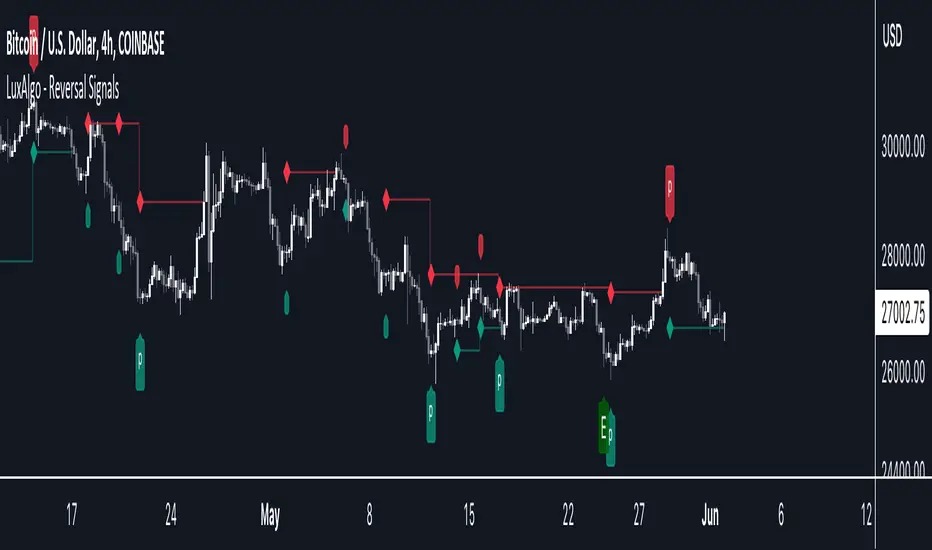 The Reversal Signals indicator is comprised of two main phases: Momentum Phase and Trend Exhaustion Phase. These phases help identify potential trend reversals in bullish, bearish, and ranging markets.