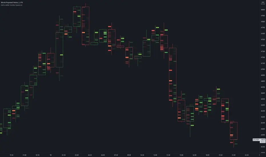 Using calculation of time and volume, the candles are created for the higher timeframe adjusted for buying and selling delta volume.