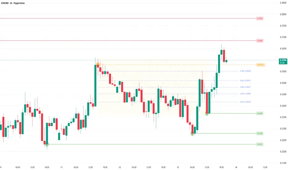 When price is BETWEEN the two levels, Fibonacci Retracement levels (0.236, 0.382, 0.500, 0.618, 0.786) are displayed