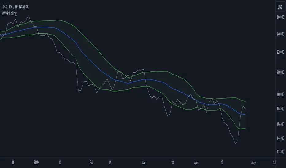 This indicator, referred to here as "VWAP Rolling," is a technical tool designed to provide insight into the average price at which an asset has traded over a specified rolling period, along with bands that can indicate potential overbought or oversold conditions based on standard deviations from this rolling VWAP.