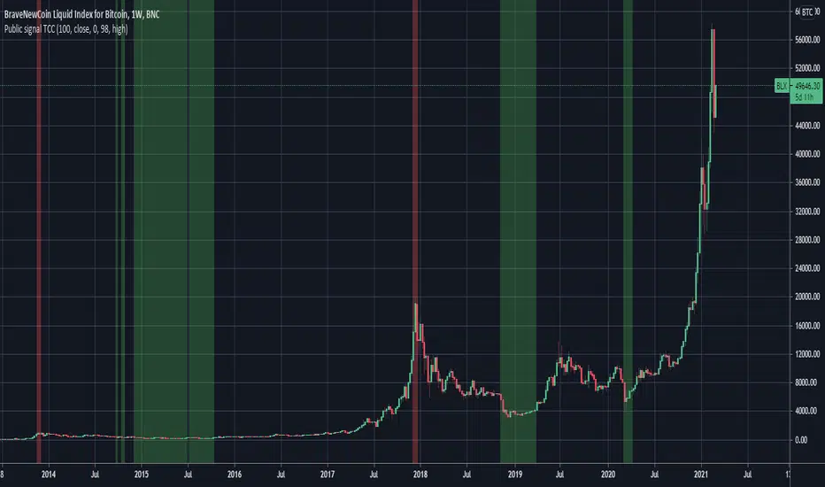 The green zones signal a bottoming for BTC/USD and the red zones signal a peaking in the value of BTC.