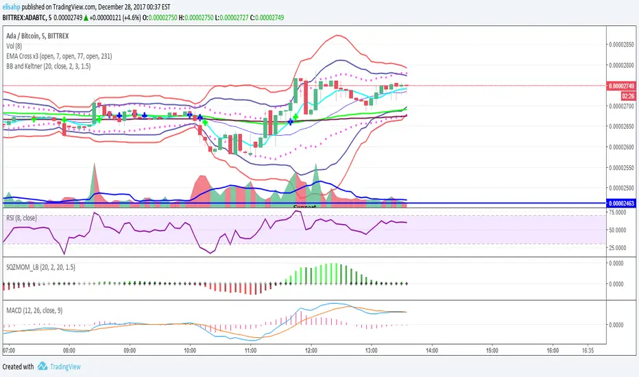 New version - minor change to an incorrect title. No change to function of script.Strategy using the Bollinger band with the Keltner Channels . Watch for the Bollinger bands (blue/red lines) squeezing inside the Keltner Channels (pink dots) for a breakout - this could be up or down so use in conjunction with other indicators.