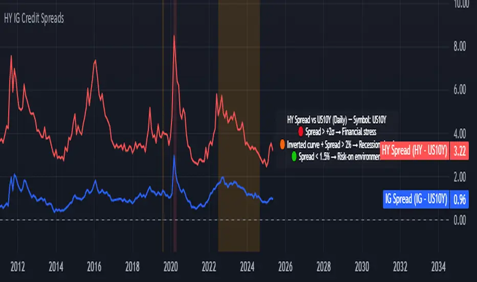 This indicator provides a dynamic and visual way to monitor credit spreads relative to the US Treasury benchmark. By comparing High Yield (HY) and Investment Grade (IG) corporate bond yields to the 10-Year US Treasury Yield (US10Y), it helps assess market stress, investor risk appetite, and potential macro turning points.
