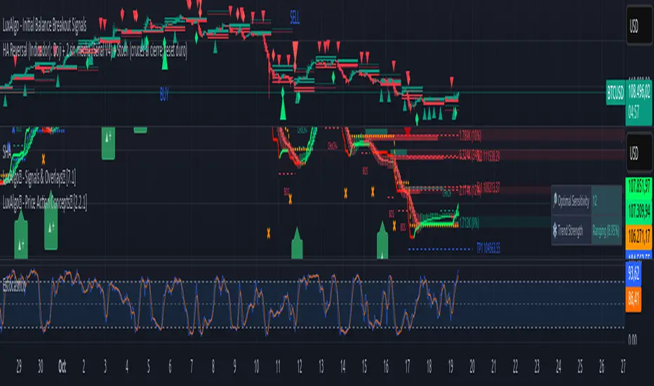 This indicator is designed to detect high–quality reversal entries using a Heikin Ashi candle pattern (Doji + 2 no–wick confirmation) combined with a strict Stochastic filter that uses memory of extreme touches to control trade direction.