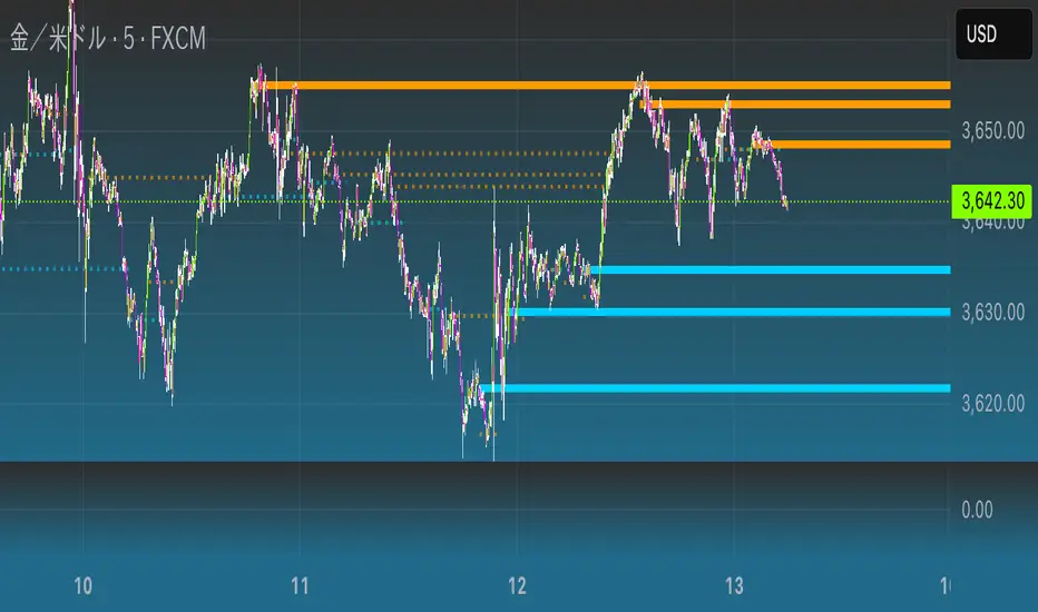特定の買い/売りパターンを検出し、その価格水準にラインを引きます。ラインは上位足の確定バーでのみ生成・無効化されるため、リプレイやリアルタイムで一貫した挙動を示します。